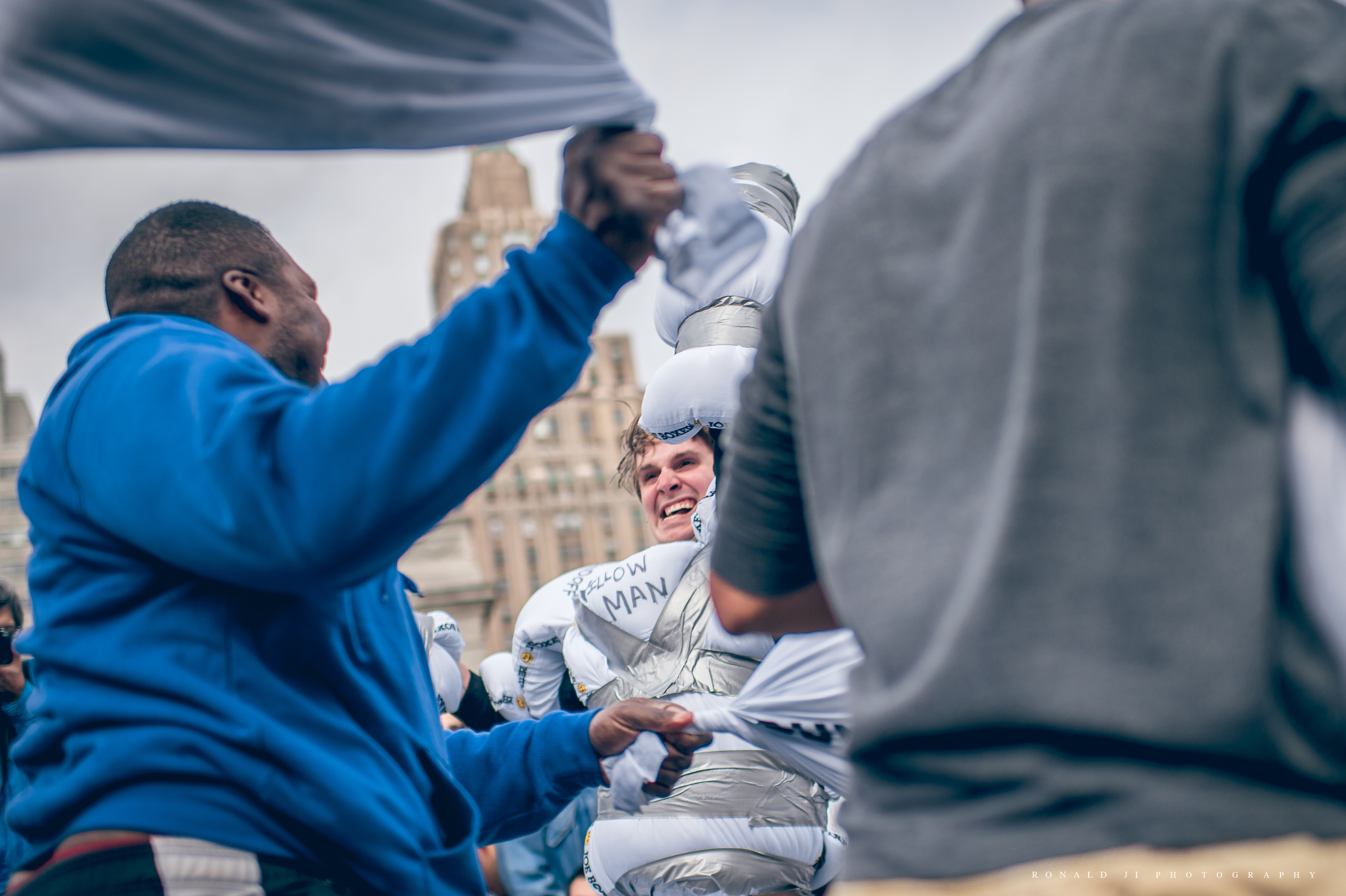 當天最受囑目的,是把自己武裝成「枕頭超人」的Pillow Man,各方好手都來向他挑戰,當中也有自願與他一組的戰友,如願的受到猛烈的戰火攻擊