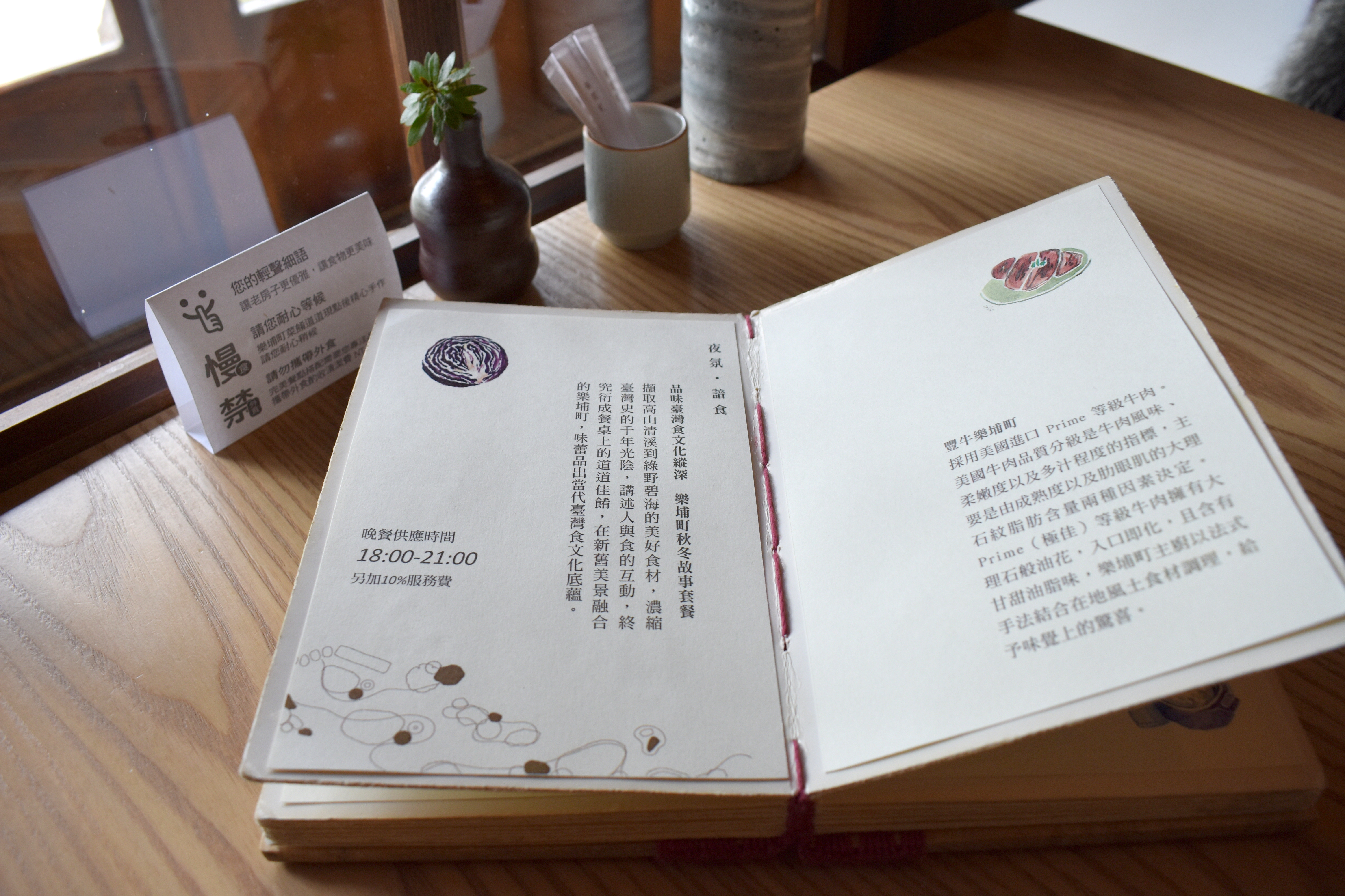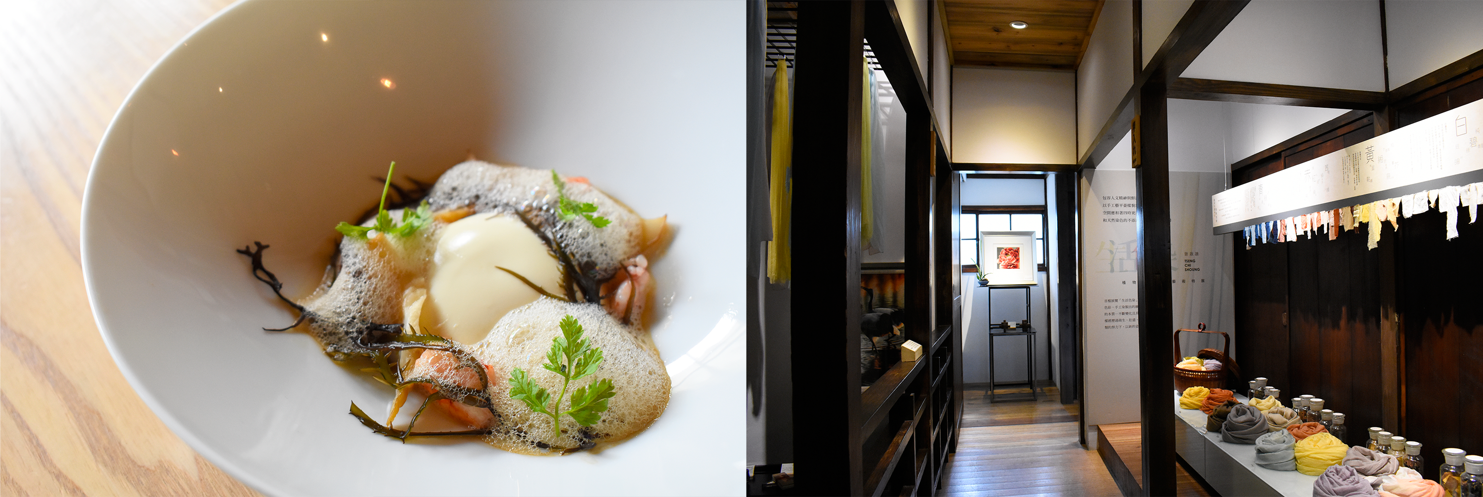 在這裡,品味美食與空間氣氛之餘,還可在藝術展示區欣賞藝術作品。目前展示的是色彩名家曾啟雄的圍巾作品「生活色染」,各種植物萃取出的天然色素,手染在羊毛、蠶絲等材質上,既輕柔且雅致,同樣是與生活美學的概念相結合。另外,樂埔町還特別規劃了小農食材展售區,選用的自然都是店內推薦的在地好食材。