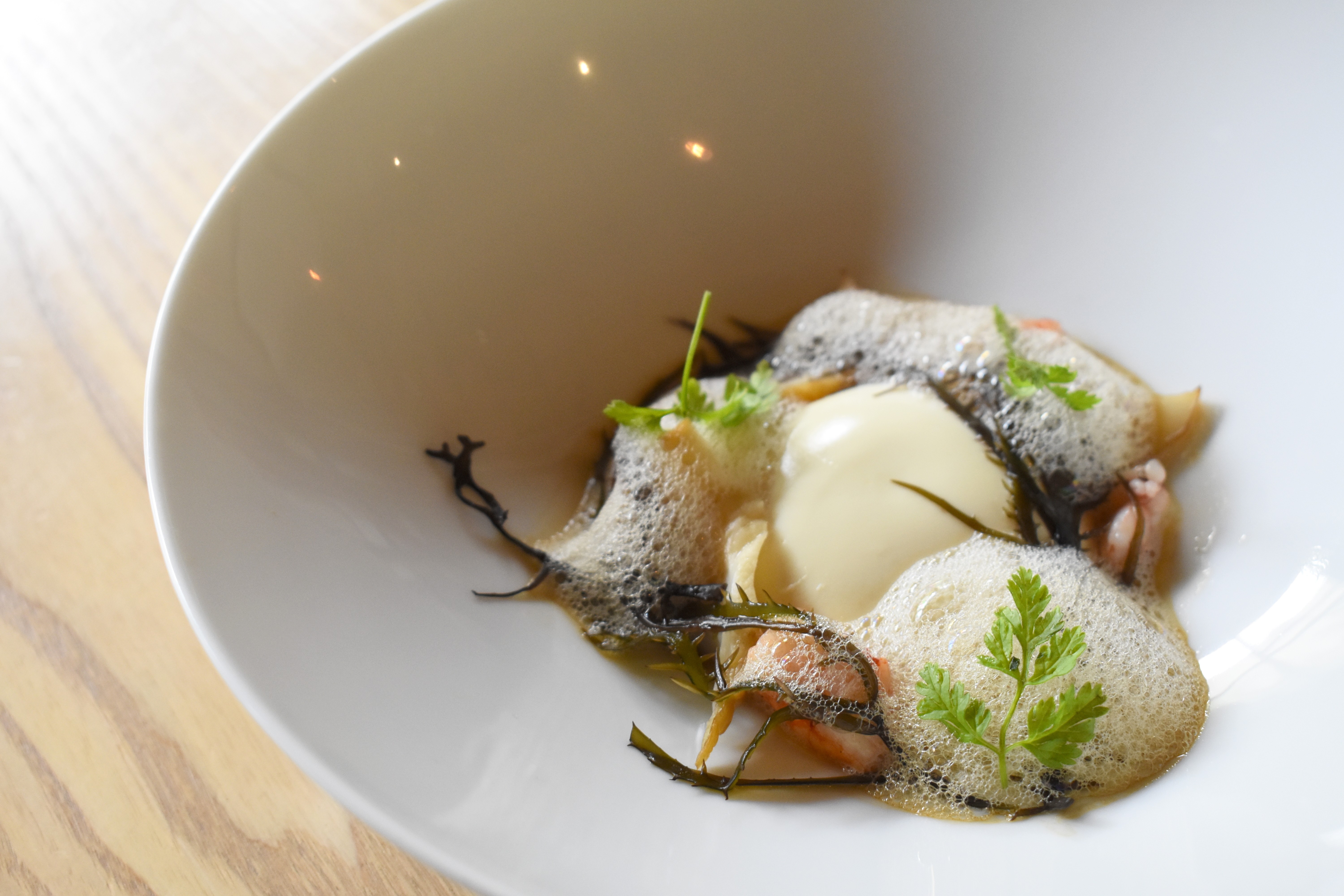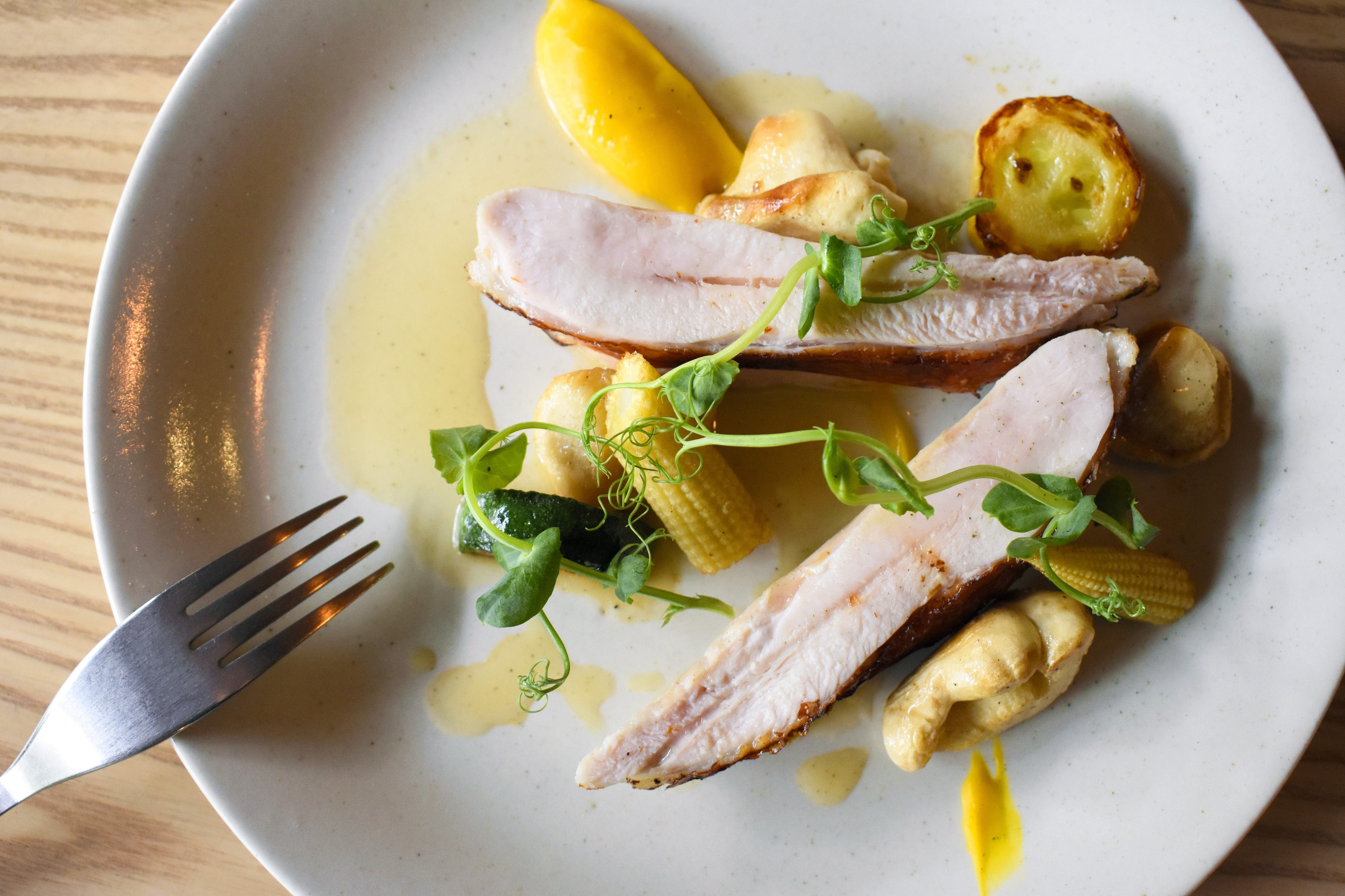 樂埔町的餐點,除了擁有法式料理擺盤的精緻度外,更使用了許多厲害的台灣在地食材,例如主菜的「季節腴豬」,是來自彰化永隆牧場、以胡蘿蔔及香菇飼養的「胡蘿蔔豬及菇菇豬」;「馨甜嫩雞」則用的是來自雲林、台灣第一隻符合國際育種標準的「桂丁土雞」。
