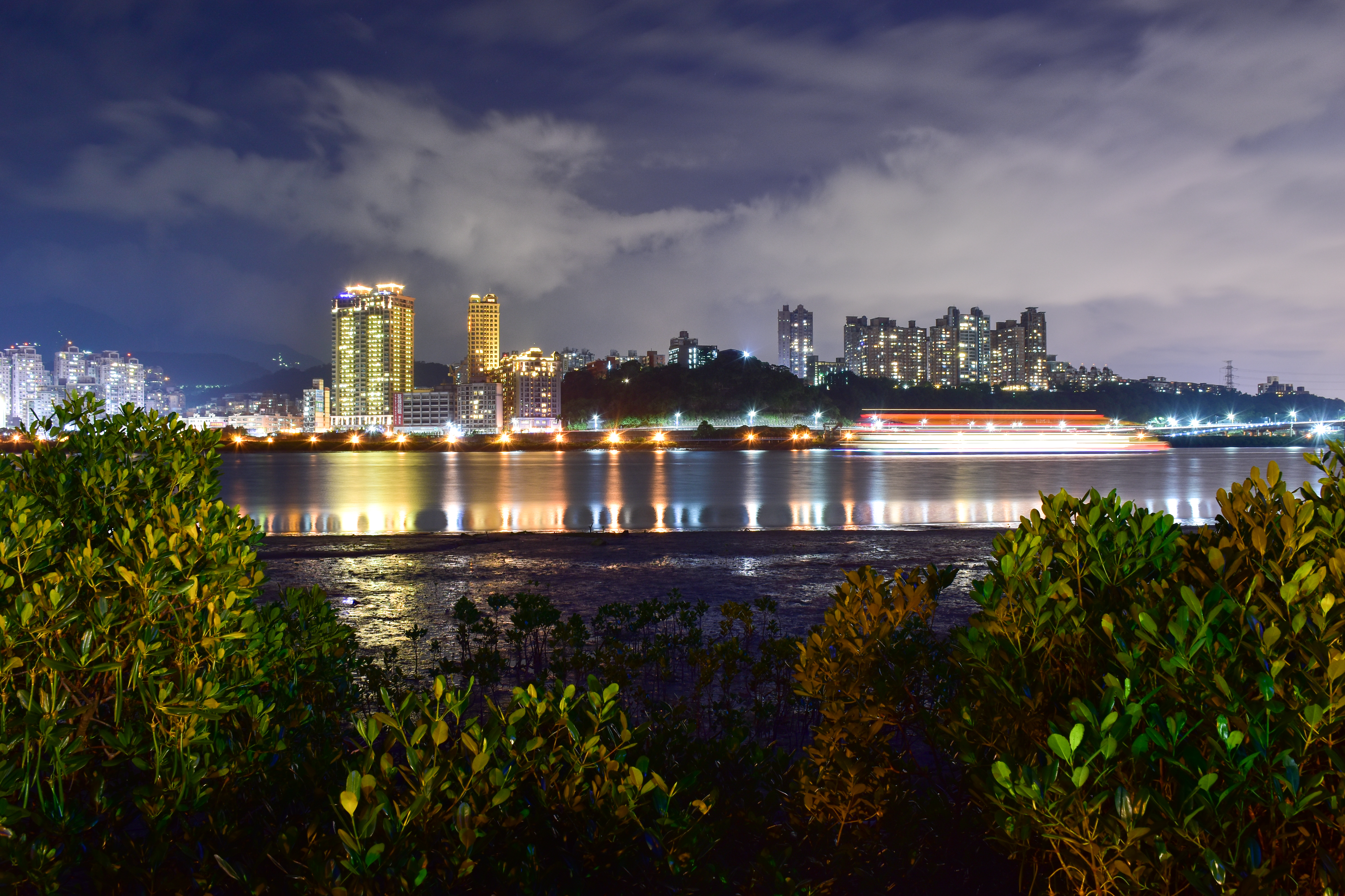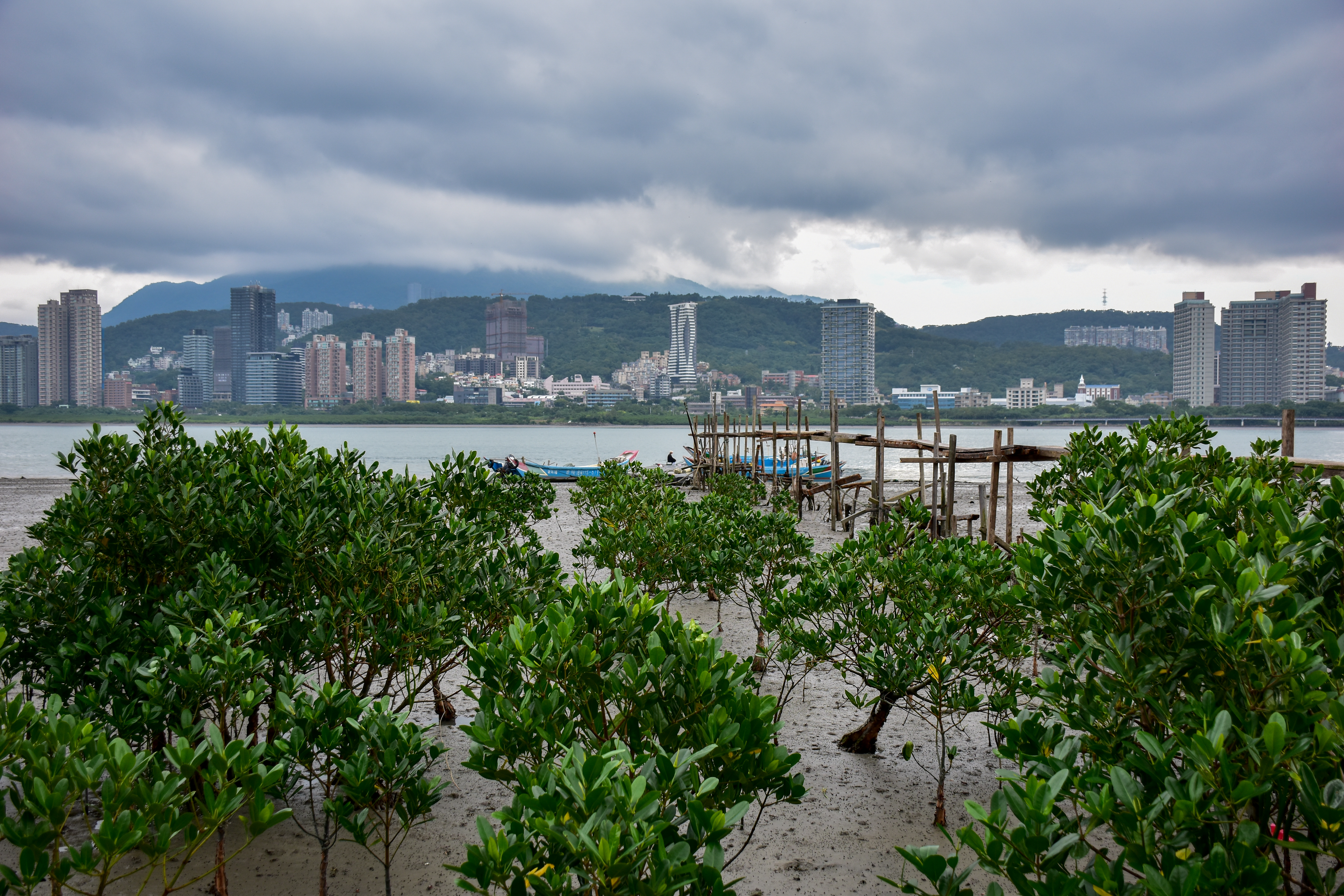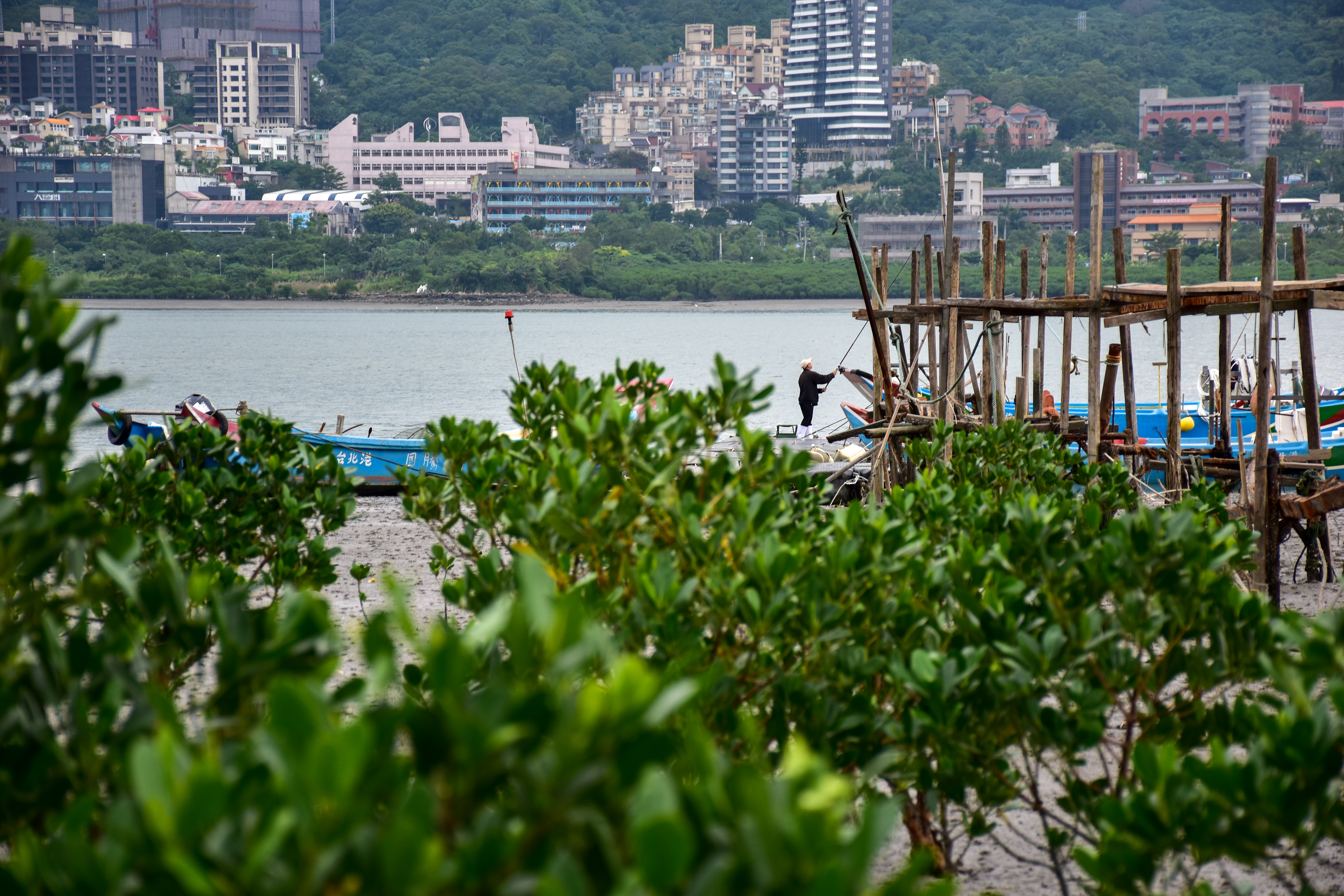 來到淡水河畔,從八里拍攝對岸的淡水,以水筆仔為前景