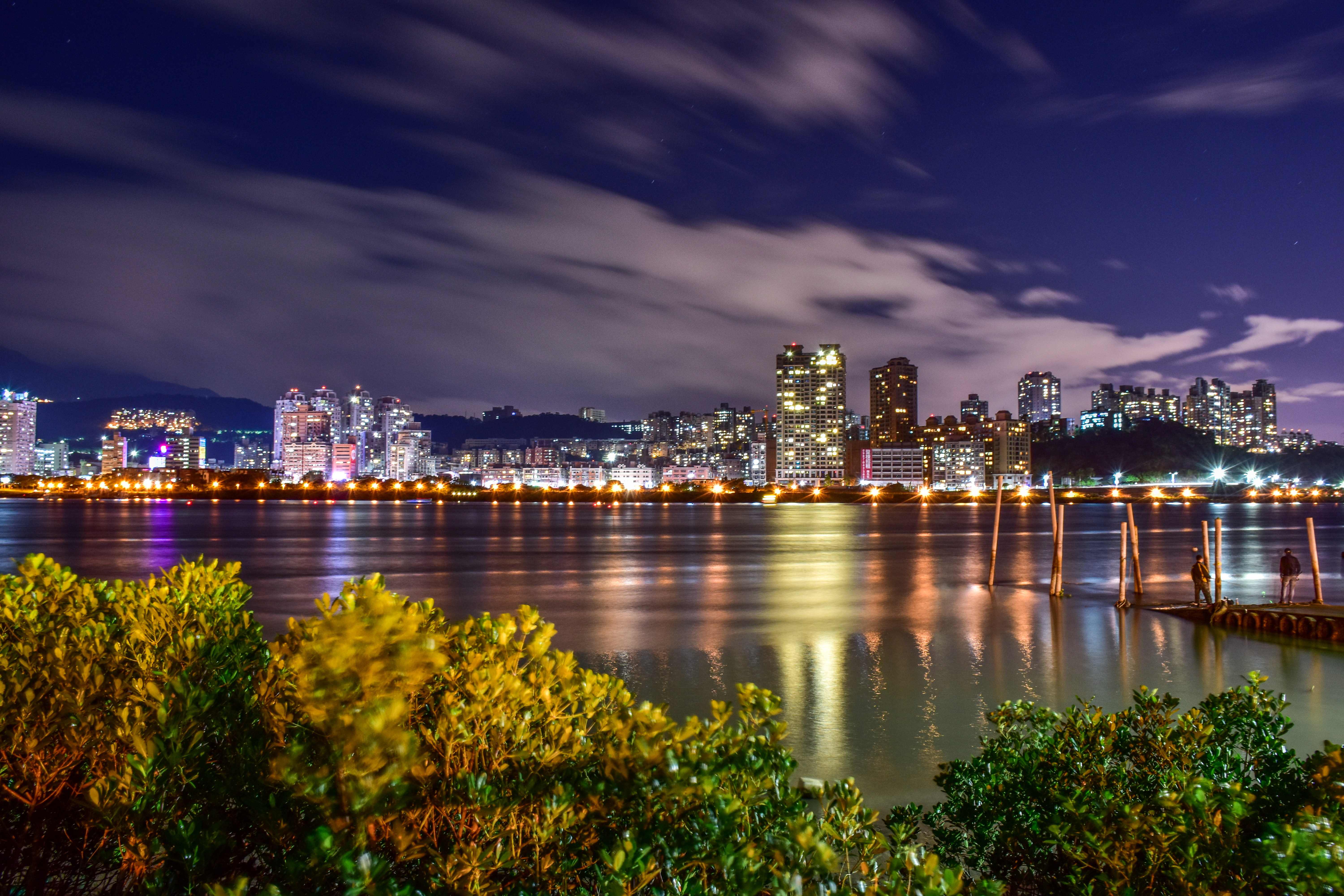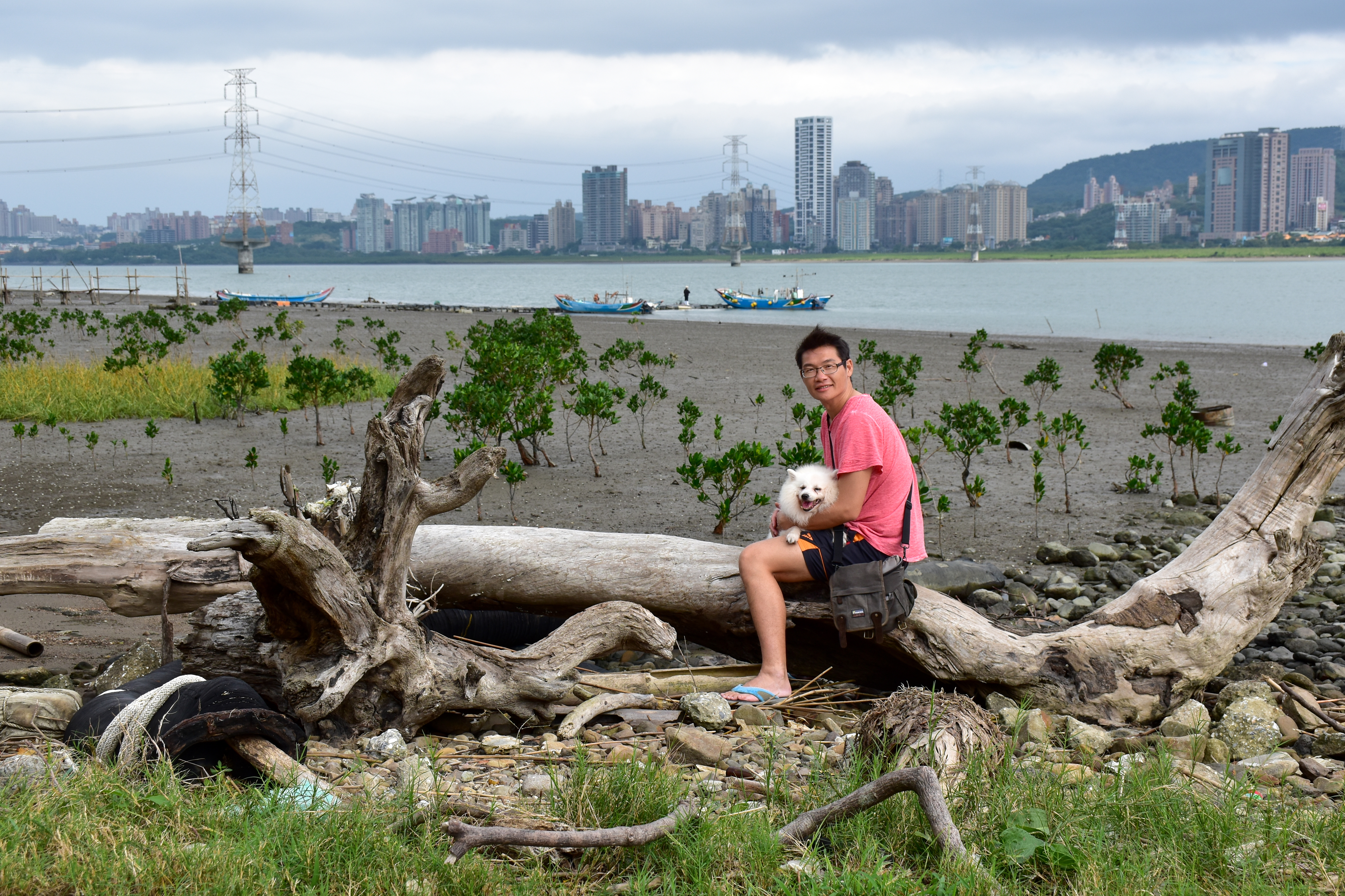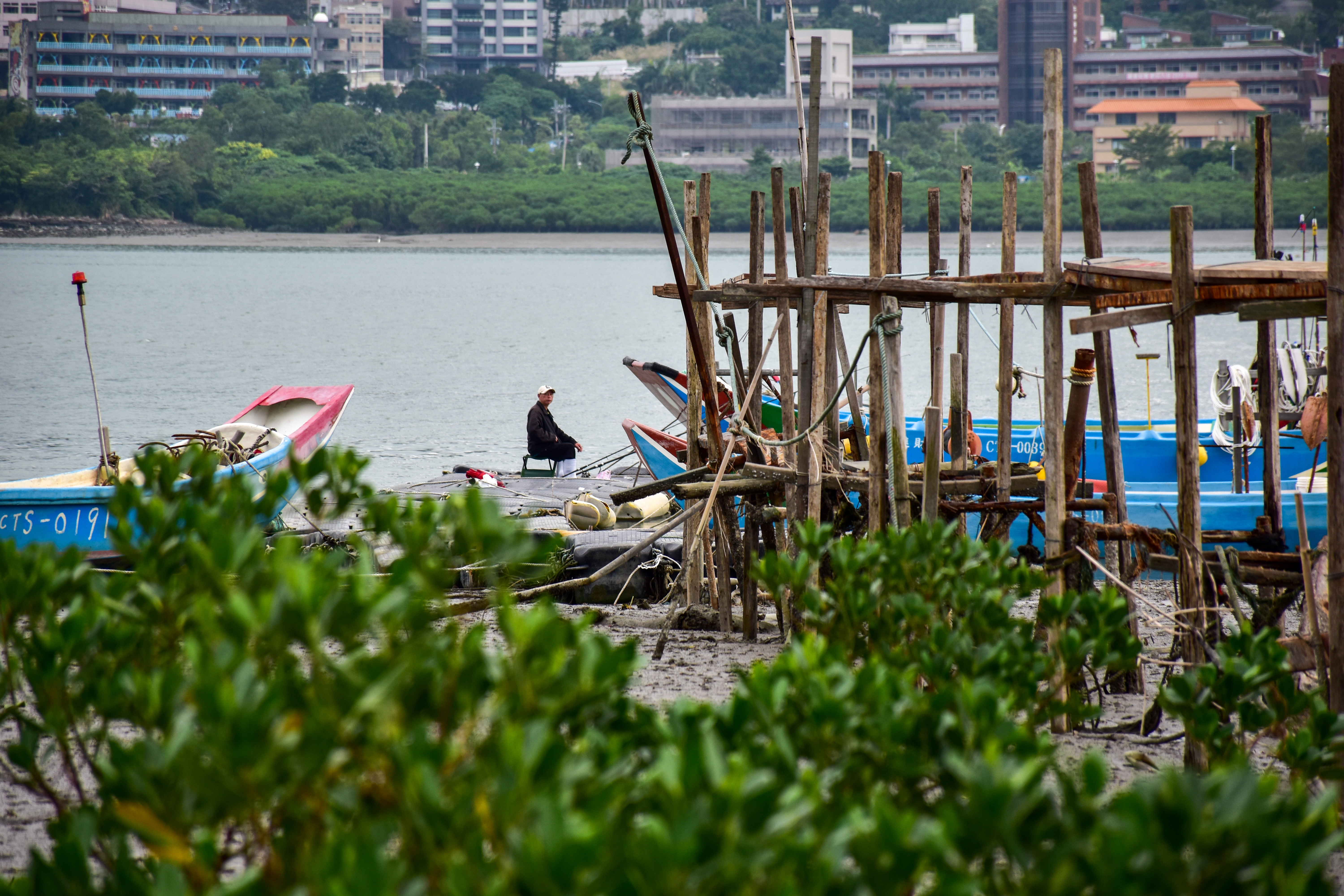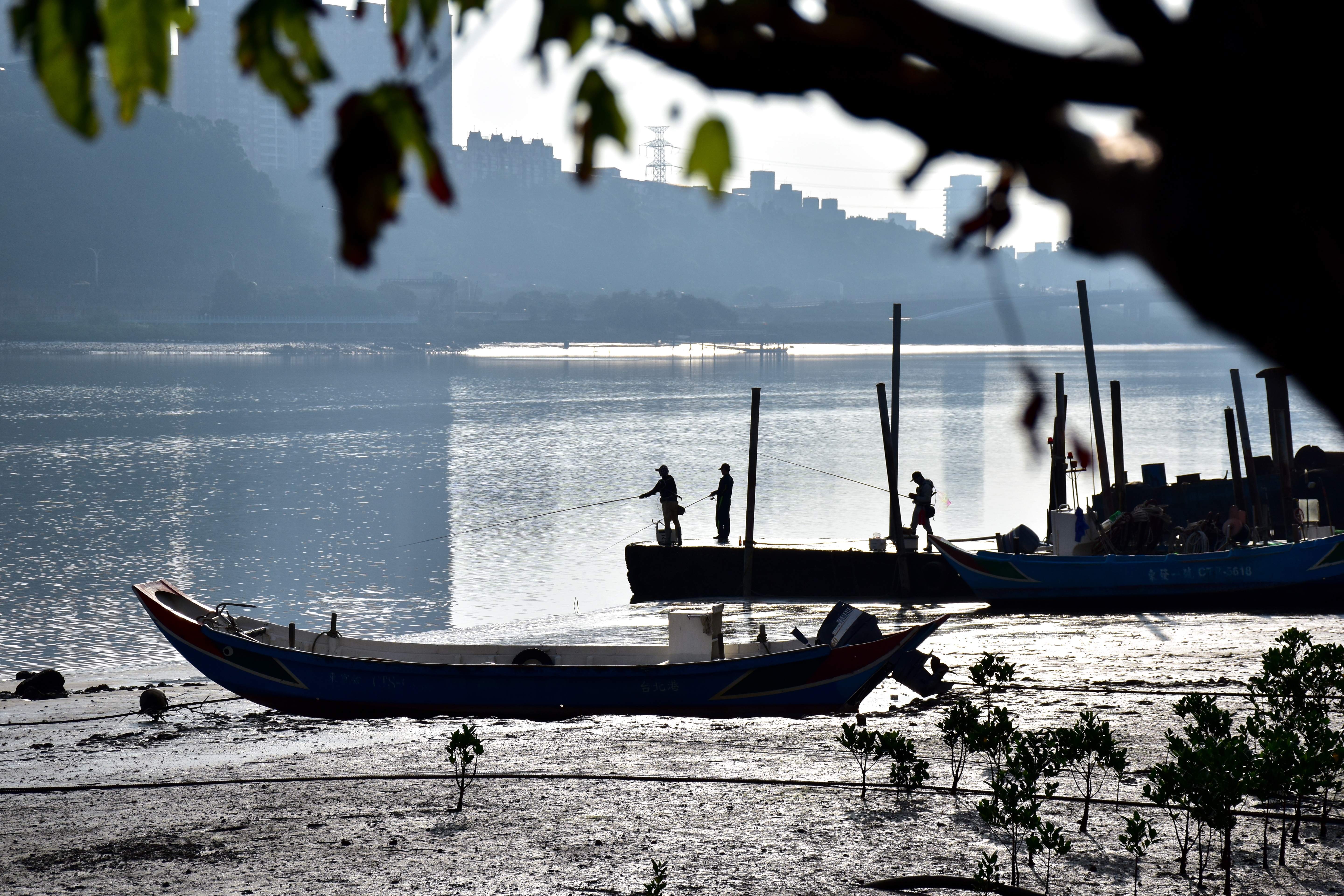 來到淡水河畔,從八里拍攝對岸的淡水,以水筆仔為前景