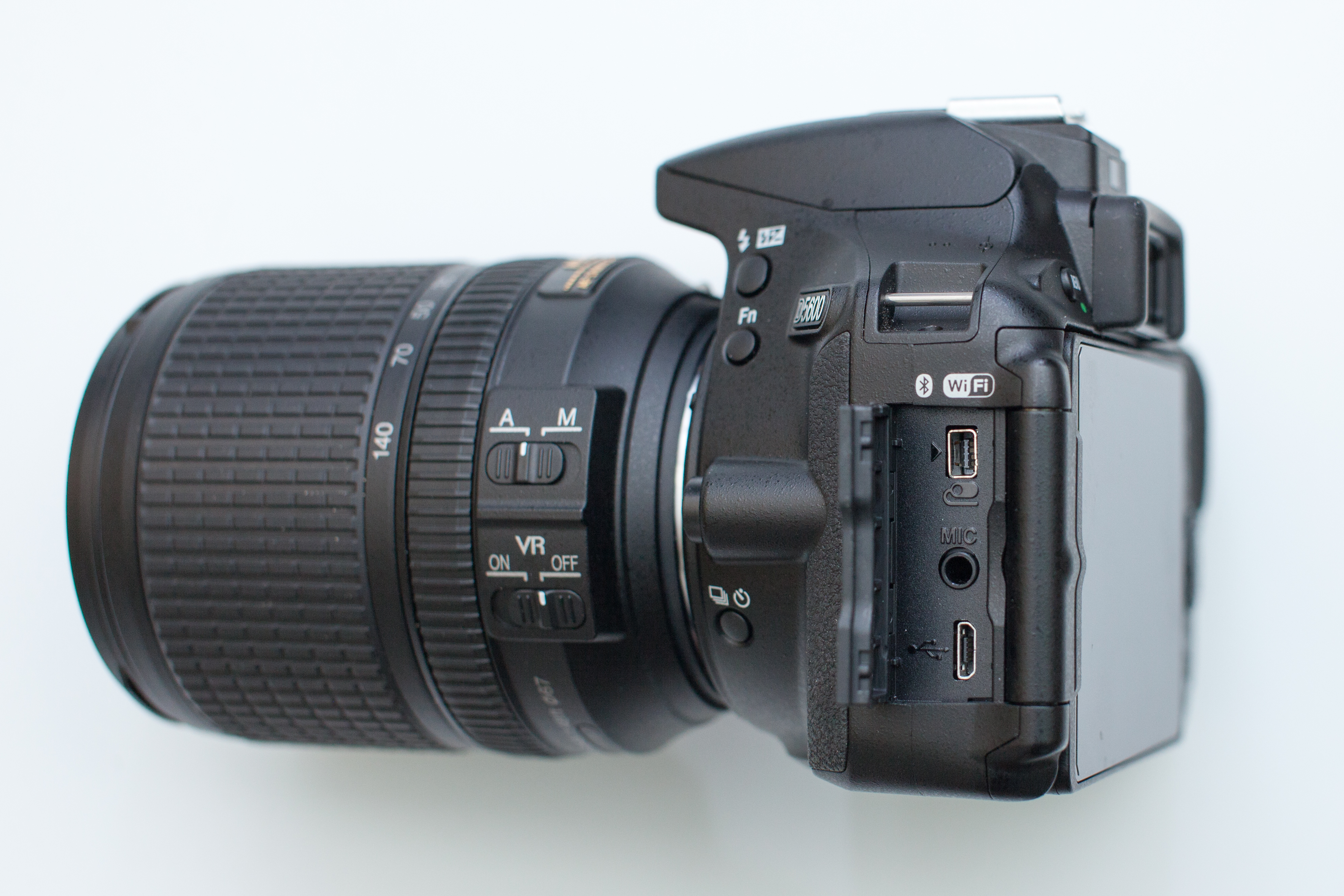 D5600 外觀及規格,相機機身左右兩側,備有:電子快門線、麥克風、MicroUSB、HDMI以及記憶卡插槽,算是該有擴充介面都有。