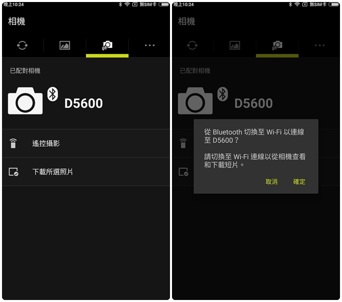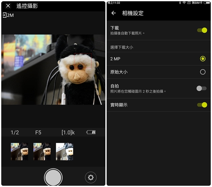 透過SnapBridge App,D5600 與兼容智能裝置之間利用 Wi-Fi 建立連線後,即可無線操控相機,並自動同步時間與位置資訊等內容。但目前只支援拍攝,無法錄影,右下圖為遙控設定選單,功能有點少,不過隨著時間的更新,想必其功能選單將不斷擴展。