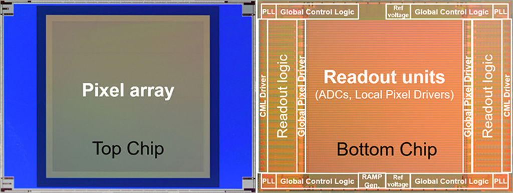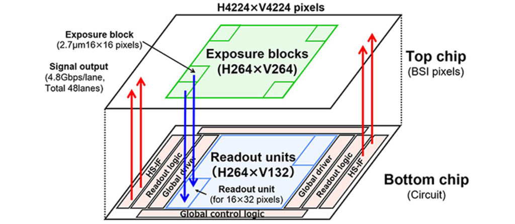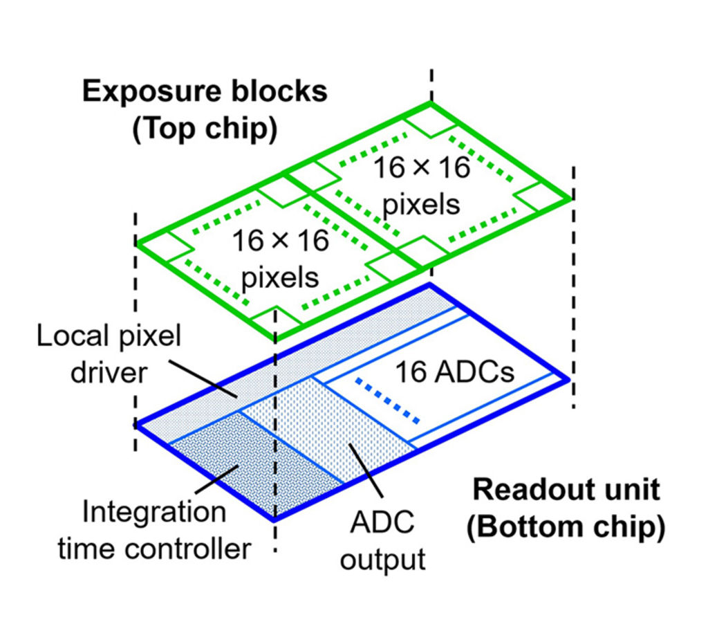 頂部晶片以 16 × 16 畫素為一塊,再以 264 × 264 塊(4224 × 4224 畫素)劃分配置於一個畫面上。捕捉畫面同時,可從底部晶片來精準控制畫面上的每個區域之曝光時間。