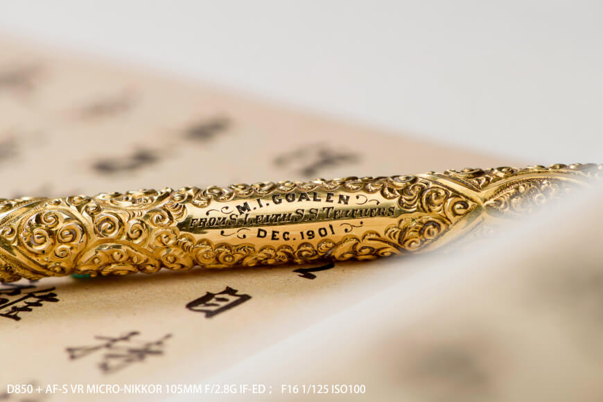 Nikon D850 擁有4,575萬像素的超高解析度,應用在商品攝影中,可不僅只有「照片可以放大」這麼簡單! 優異的高動態範圍,高性能的對焦能力,新的包圍對焦等功能,對商品攝影來說,有著非常強大的魅力。 要拍出鋼筆的美感,就要從忠實的呈現製筆工藝開始下手。無論是鋼筆設計師的獨到巧思,還是製程的品質堅持,均藉由拍攝者的觀察力,以及D850的豐富解像力,互相搭配,無一不漏地詮釋。