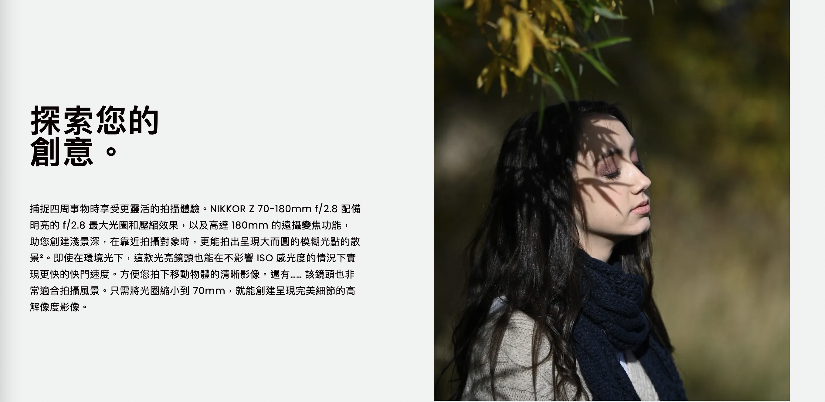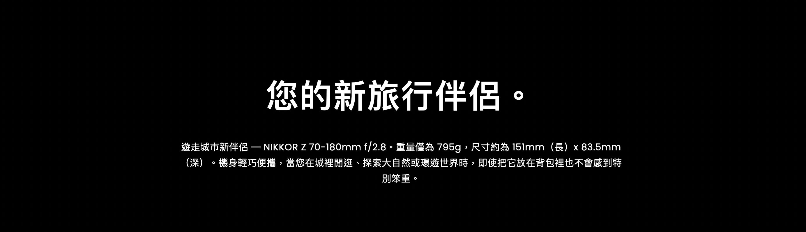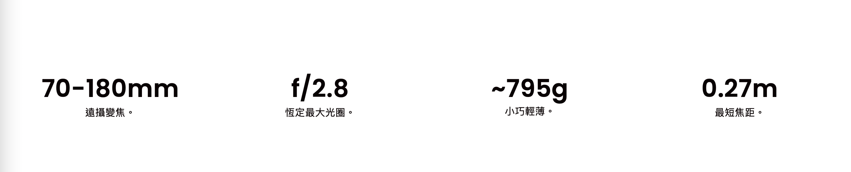 這款望遠變焦鏡頭輕巧便攜,非常適合隨身攜帶進行照片和影片拍攝。配備 f/2.8 恆定最大光圈,使其成為拍攝人像的完美選擇。助您在如幻如實的柔和散景背景下突顯拍攝主體。此外,其 70-180 mm 望遠焦距更廣泛的攝影範圍,可擴展焦距達 360mm,一個鏡頭擁有各式功能。
