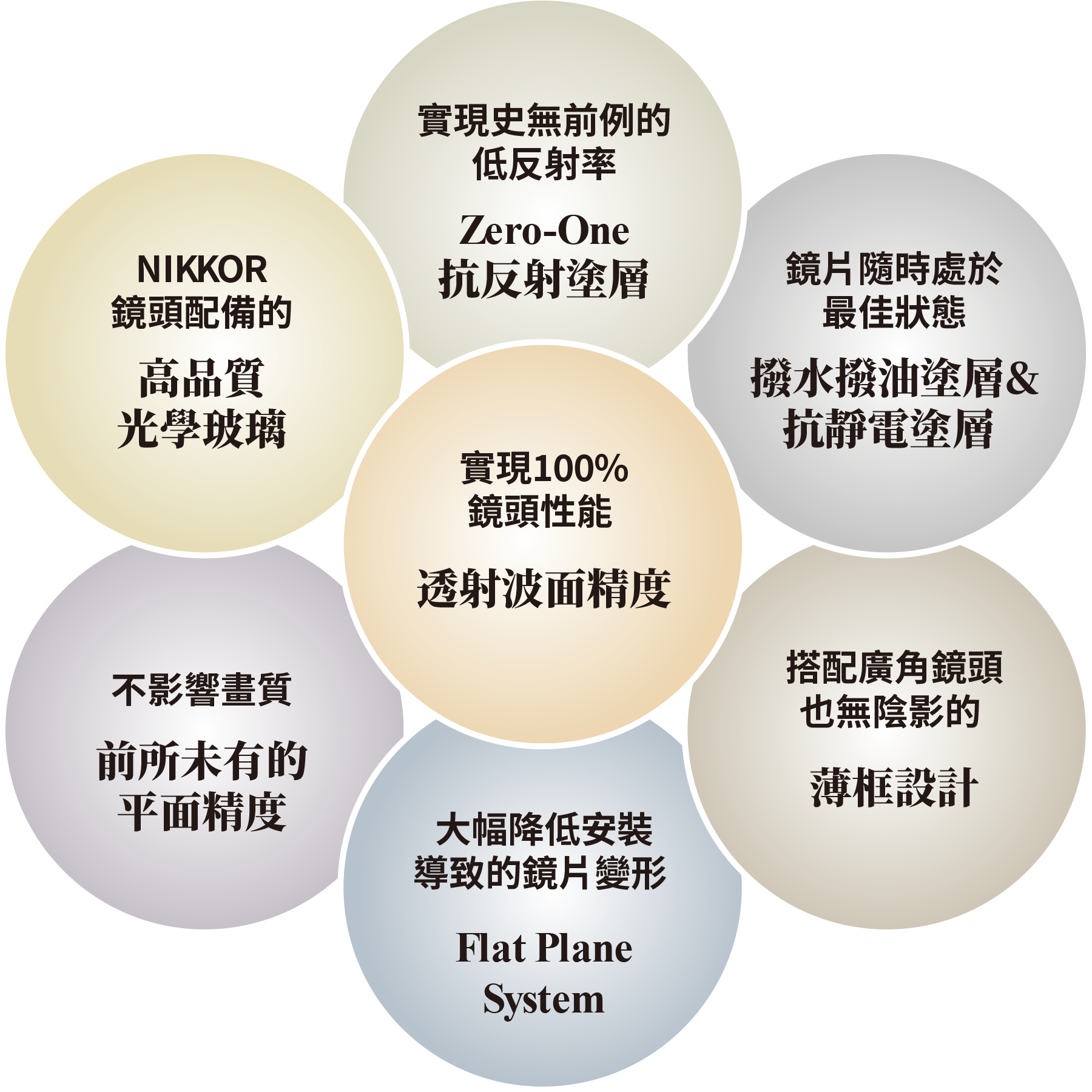 使用 Nikon 獨特的技術,濾鏡使用了名為「Zero-One AR Coat」的多層鍍膜,其在420奈米到680奈米的可見光範圍內具有接近0.1%的超低反射率。由於波長差異而引起的反射率變化很小,能夠最大程度地減少色彩平衡的干擾,同時減少鬼影和眩光的發生。這有效避免了使用濾鏡導致細節損失的問題,使得高對比度、豐富的色彩漸變成為可能。即使在拍攝夜景或星空時,成像幾乎不受影響。