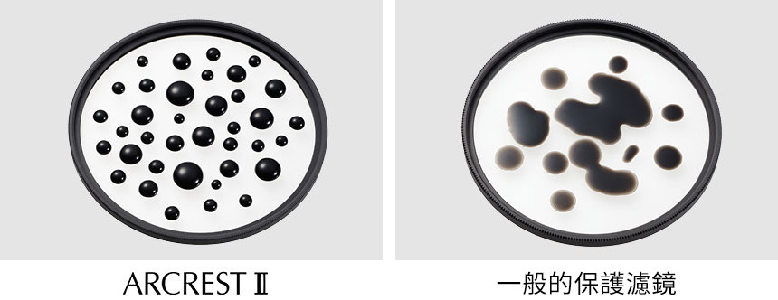 ARCREST II 使用了專門為濾鏡開發的獨特的疏水抗油塗層。它展現出高抗污能力,使得水滴、油和指紋等污垢難以附著,即使不慎沾到了,也能輕鬆擦拭乾淨。它還具有高耐用性,通過了200克負荷下超過1000次的擦拭測試。抗水抗油塗層被應用於玻璃的兩側,即使在惡劣的拍攝環境中,您也可以安心專注於拍攝。
